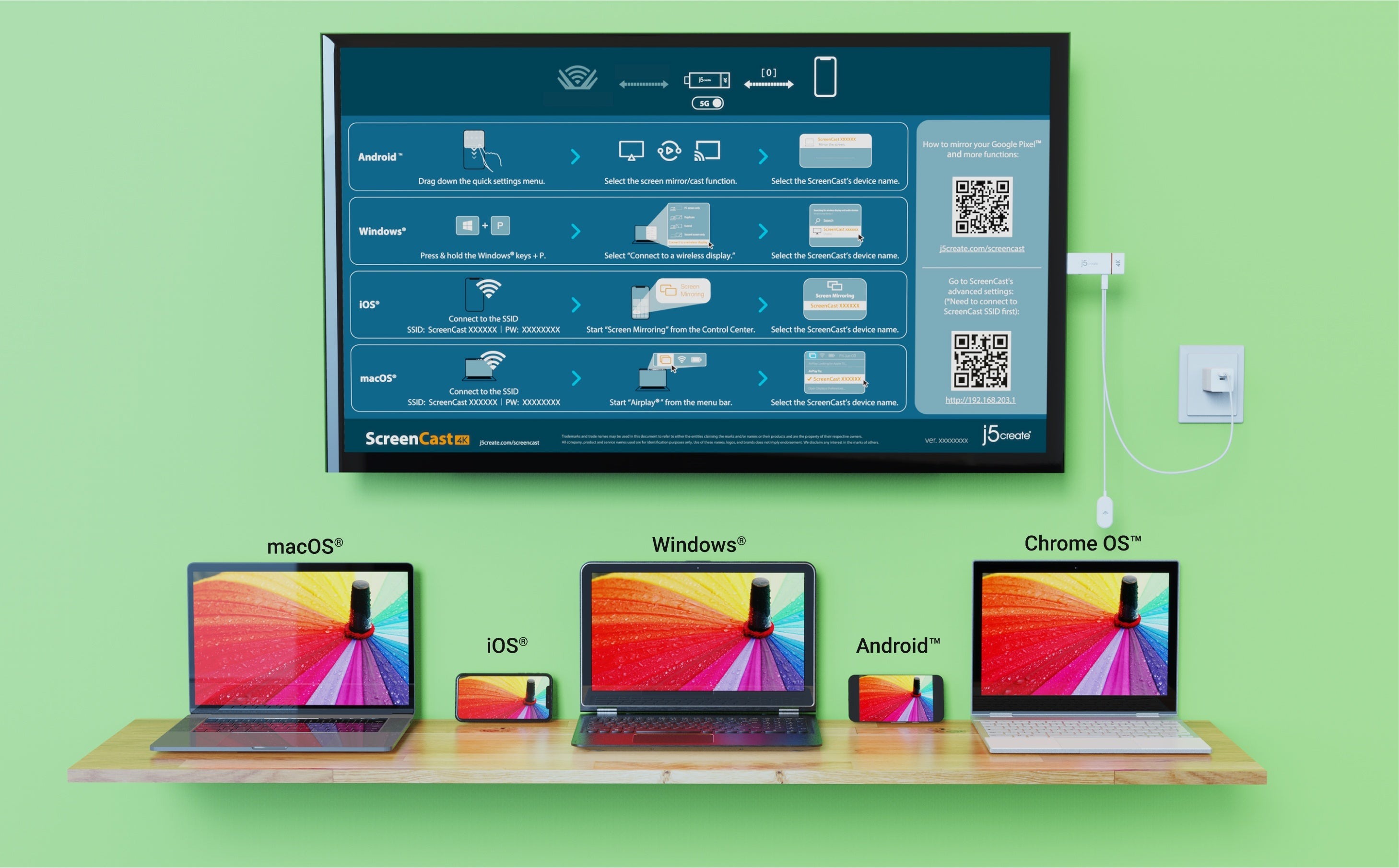 Просто підключіть адаптер, живлення до нього та під'єднайтеся до ScreenCast 4K (відстань бездротової передачі до 15 м у відкритому просторі), щоб розпочати передавання. Дізнайтеся більше: https://j5create.com/screencast/