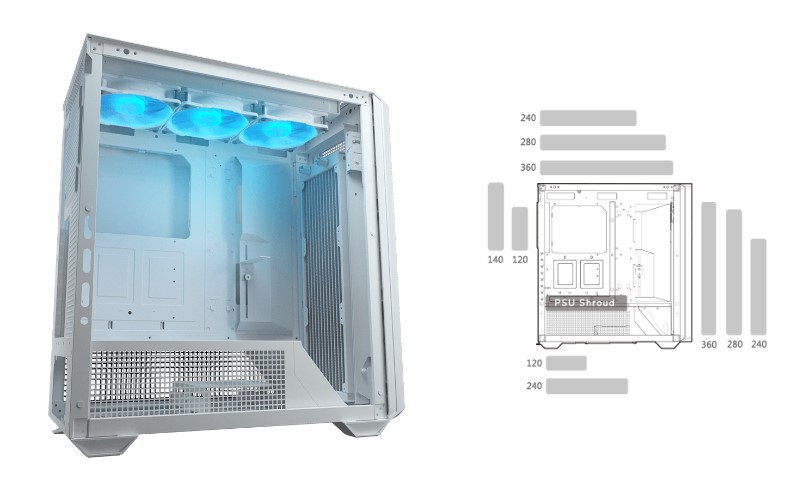 MX600 RGB поддерживает варианты двойного 360-мм водяного охлаждения на верхней и передней панелях.