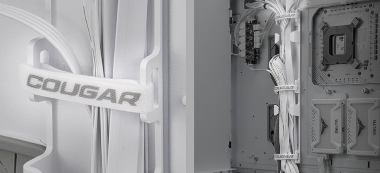 Премиальная конструкция для прокладки кабелей включает в себя направляющие для прокладки кабелей и семь ремней на липучке для фиксации кабелей. Лаконичная крышка скрывает все от глаз, упрощает организацию и обеспечивает безупречный вид вашей сборки.