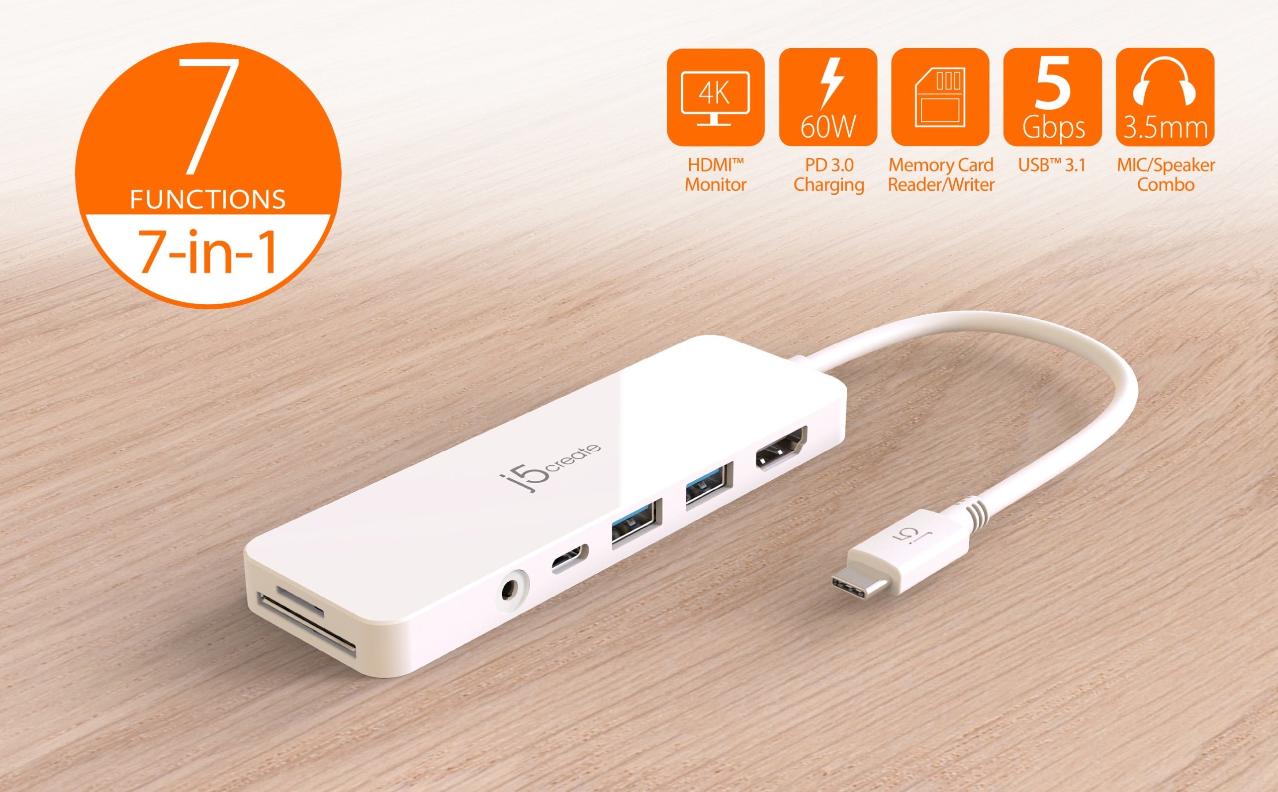 Мультиадаптер USB-C 6-в-1 (хаб/HDMI/картридер/аудио), белый j5create JCD373-N - StockRoom