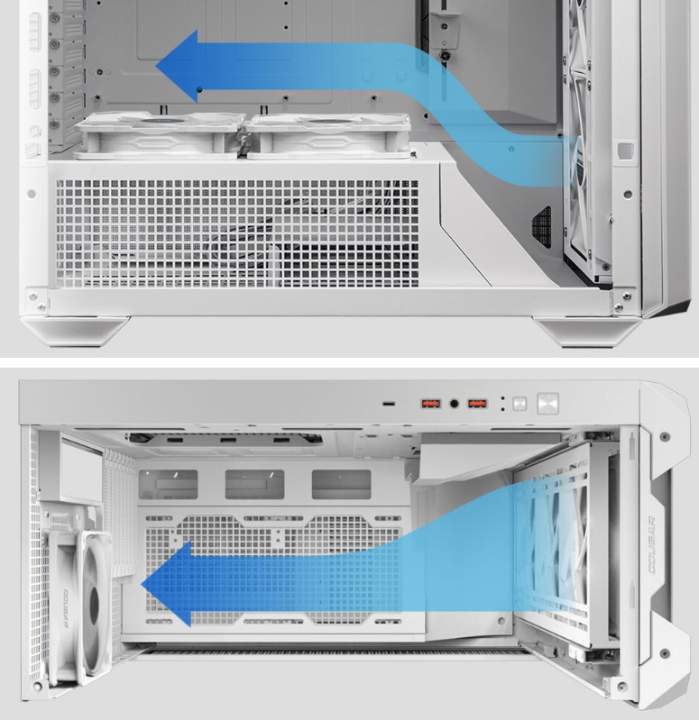 Попрощайтеся з гарячим обладнанням: MX600 RGB захищений від підвищення температури завдяки повній всеспрямованій вентиляції. Перфорована передня сітка і збільшена висота відсіку для блока живлення з повітрозабірними отворами сприяє ефективній прохідності повітря.