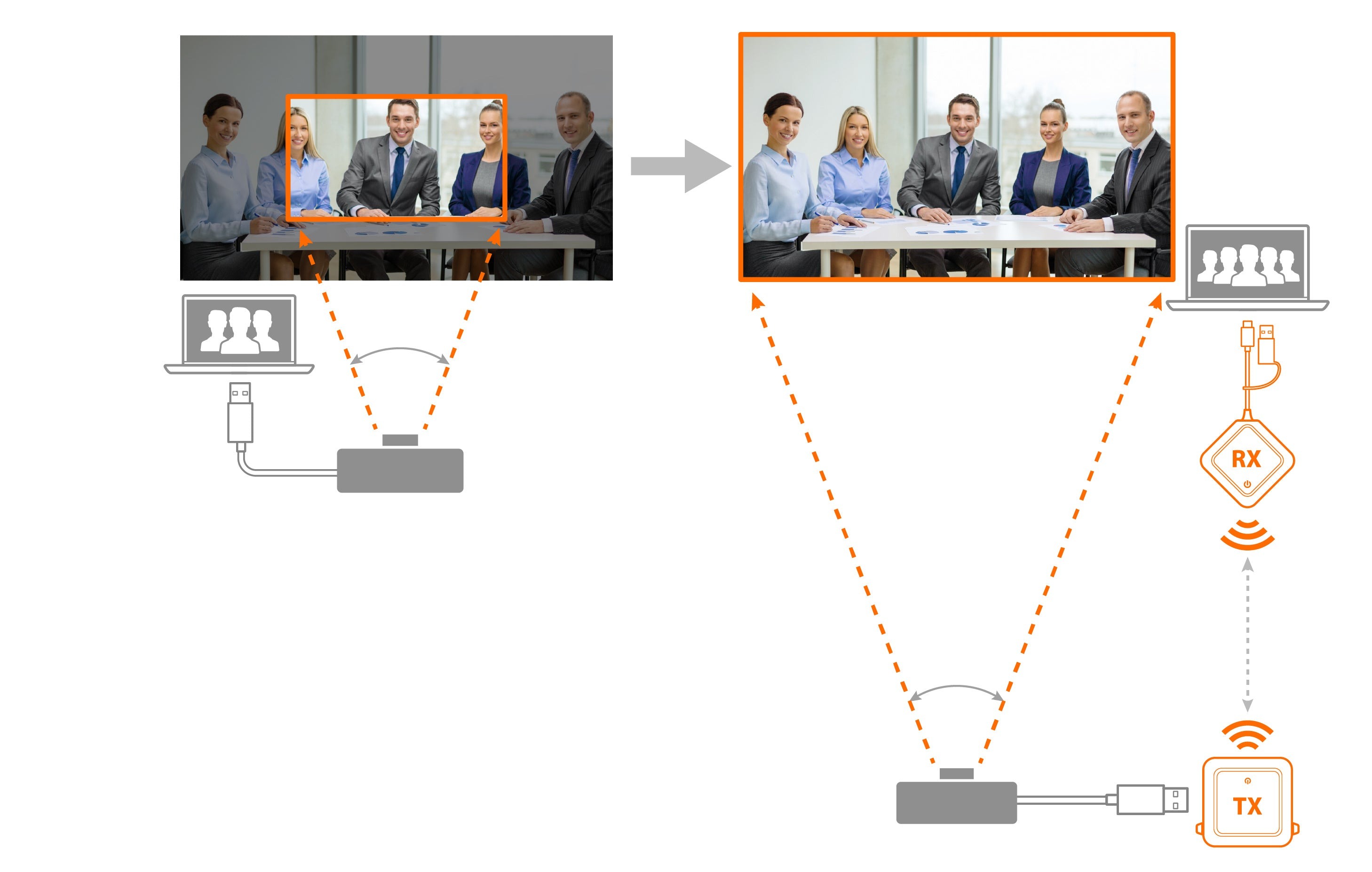 - Пристрої TX і RX підключаються та сполучаються між собою автоматично. Якщо пристрої правильно сполучені, а USB™-камера підключена до TX, камера активується автоматично.