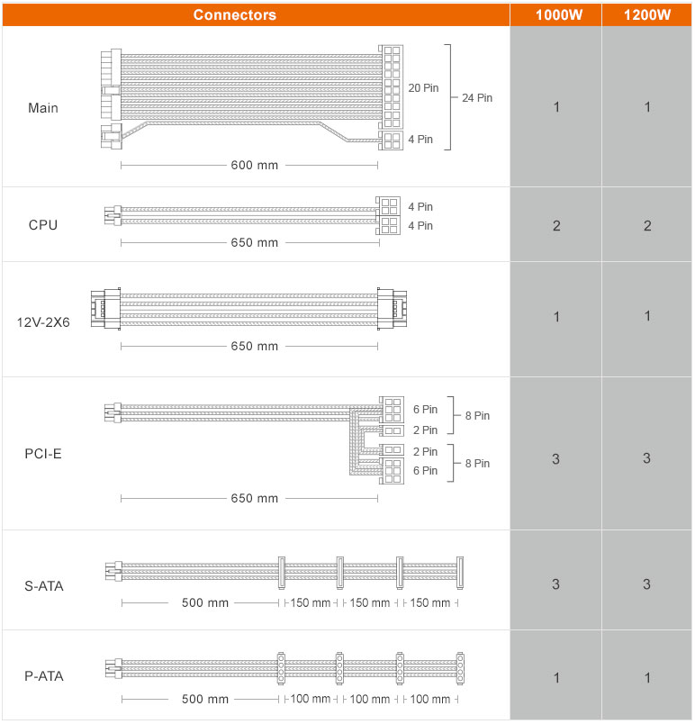 Серія COUGAR GLE підтримує новітню специфікацію PCIe 5.1: її потужна та стабільна продуктивність відповідає потребам графічних процесорів наступного покоління. Оснащений власним модульним роз'ємом PCIe 12V-2X6, довжина 650 мм забезпечує достатній запас для зниження ризику неправильного з'єднання під час встановлення ПК без необхідності використання адаптера з контактами 6+2.