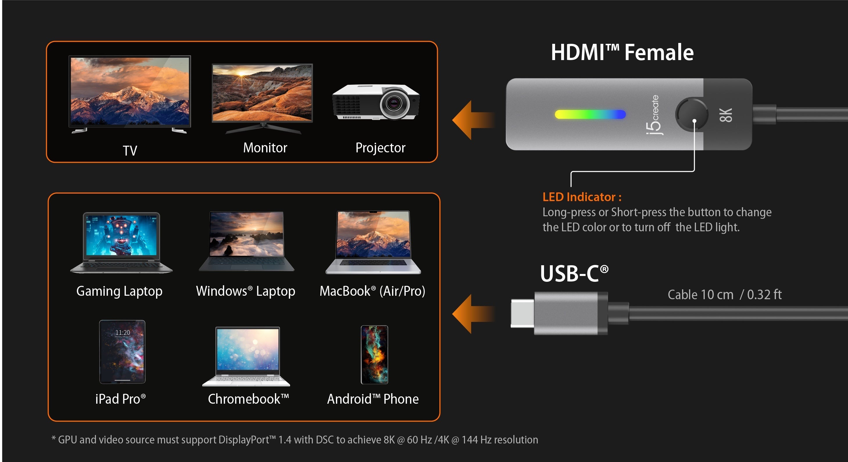Цей перехідник пропонує новітню технологію підключення USB-C® до 8K або 4K 144 Гц HDMI™, що дозволяє підключити HDMI™ дисплей до ігрового ноутбука, планшета або телефону, який підтримує DisplayPort™ Alternate Mode для підключення за принципом « Plug and Play ».