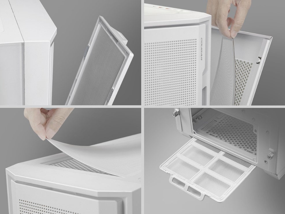 Чотирикутні пилозахисні екрани захищають від частинок пилу і забезпечують чистоту та ефективність системи. Магнітні екрани на передній і правій сторонах доповнюють стандартну магнітну верхню і висувну нижню кришки, забезпечуючи простоту установки і очищення без шкоди для захисту.